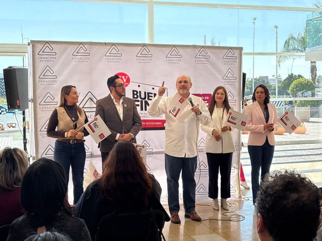 En las instalaciones de Plaza Galerías, el presidente de la Cámara Nacional de Comercio en Pequeño (CANACOPE) en Querétaro, Eduardo Chávez Hidalgo, dio el banderazo de salida a la campaña 2025 de El Buen Fin; en compañía de autoridades legislativas y de economía.