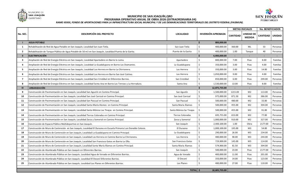El municipio de San Joaquín dio a conocer la actualización extraordinaria número 04 del Programa Operativo Anual de Obra 2026, financiado a través del FAISMUN, con una inversión total de 18.6 millones de pesos.