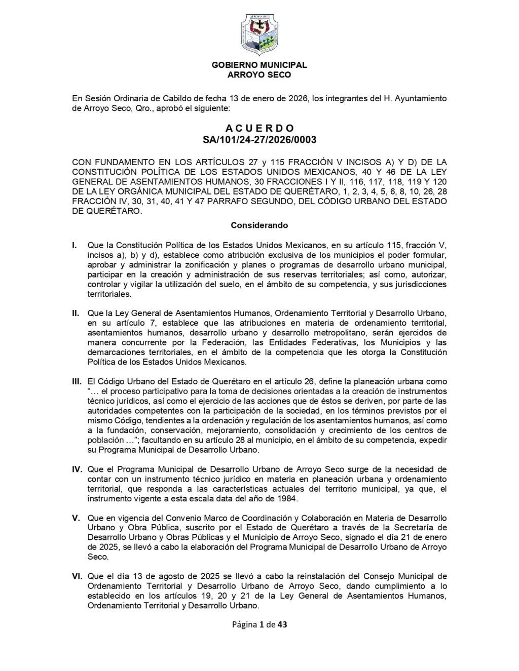El Gobierno Municipal de Arroyo Seco informa a la ciudadanía sobre la publicación de su Programa Municipal de Desarrollo Urbano, instrumento rector que establece las bases normativas, técnicas y estratégicas para el ordenamiento territorial y el desarrollo sostenible del municipio.