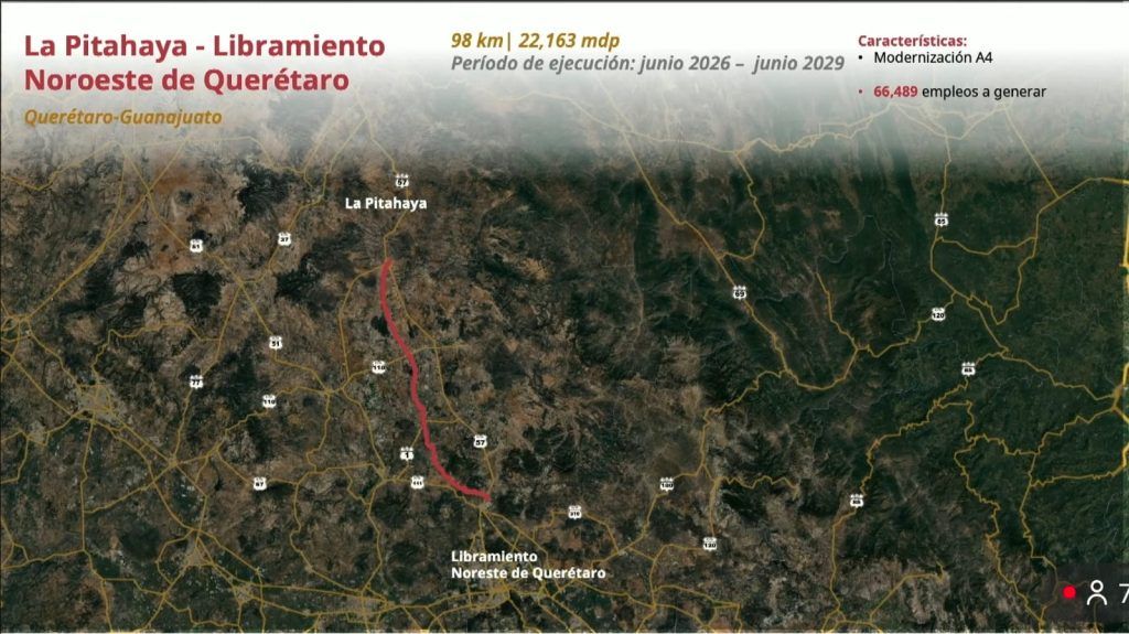 Asimismo, anunció la ejecución de otra obra que irá de La Pitahaya, Guanajuato, al Libramiento Noreste en Querétaro, como continuación de la carretera federal 57D, la de cuota.