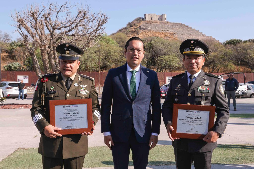 Recibieron los reconocimientos el Gral. de Bgda. de E.M. José Guillermo Lira Hernández, comandante de la Décimo Séptima Zona Militar; y el coronel de la Guardia Nacional, Jesús Vázquez Flores, coordinador policial de la Coordinación Estatal de la Guardia Nacional en Querétaro, en representación del Gral. de Bgda. de la Guardia Nacional de E.M. Alfredo Salgado Vargas, coordinador estatal de la Guardia Nacional en Querétaro.