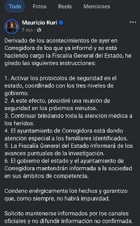 «Derivado de los acontecimientos de ayer en Corregidora de los que ya informó y se está haciendo cargo la Fiscalía General del Estado, he girado las siguientes instrucciones: